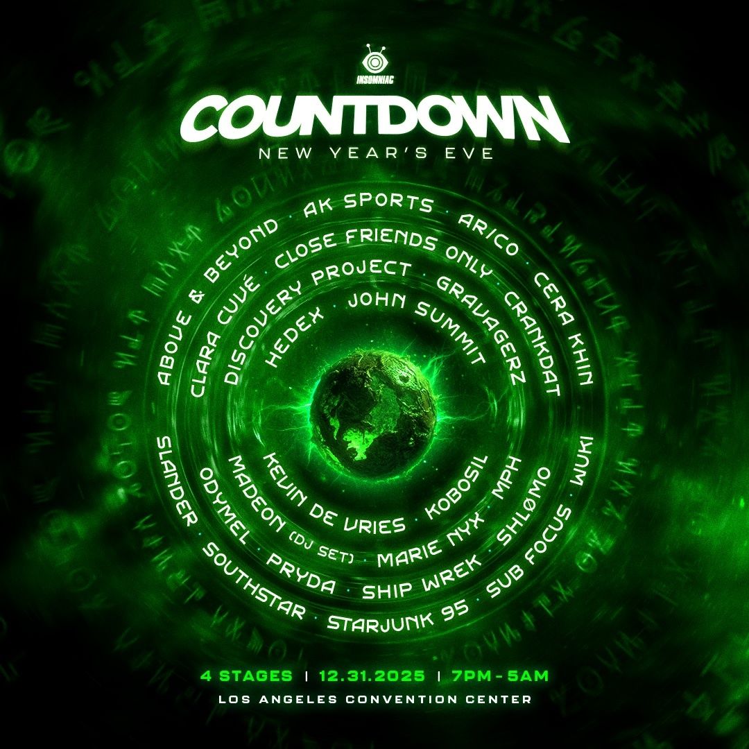 Countdown NYEThe aliens have landed, and they’re ready to rave. Insomniac’s Countdown NYE is crash-landing at the LA Convention Center for one last intergalactic throwdown of 2025. We’re talking earth-shaking bass, unholy visuals, and sets that’ll melt your little brain ‘til 5AM.* |