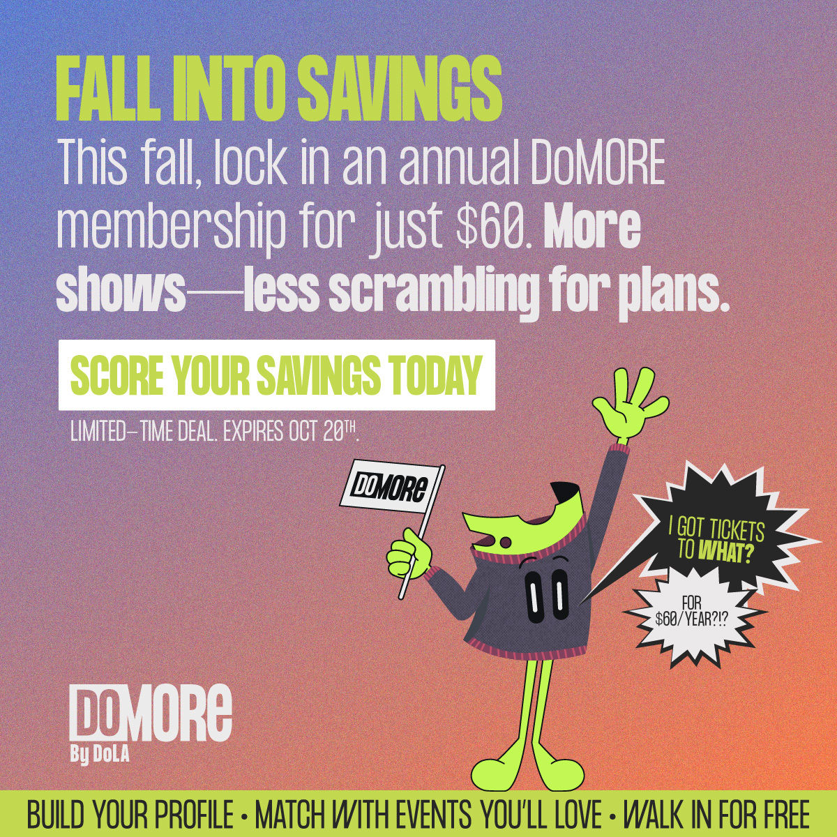 When jacket weather hits, the best gigs happen. Grab a DoMORE annual membership for $60 (regularly $84) - only for a limited time. Build your profile for curated tickets to shows you’ll vibe with, from indie haunts to festival afters, no cash needed at entry. It’s the slick way to dodge a dull fall.
